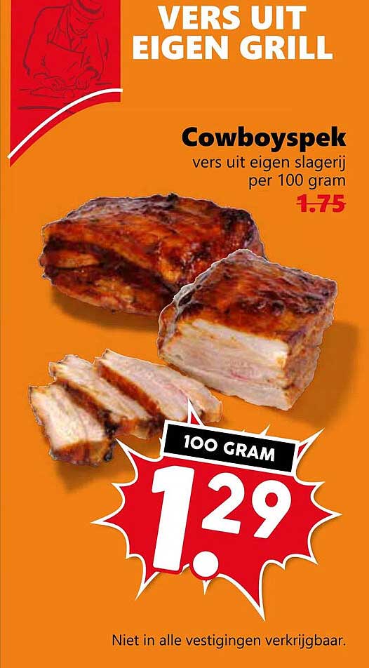 Dit Cowboyspek is met zorg bereid en komt rechtstreeks uit de grill van onze slagerij. Het is verkrijgbaar per 100 gram, waardoor je precies kunt kopen wat je nodig hebt. De kwaliteit van het vlees en de smaak zijn onovertroffen. Je kunt rekenen op een vers product, bereid met de beste ingrediënten.