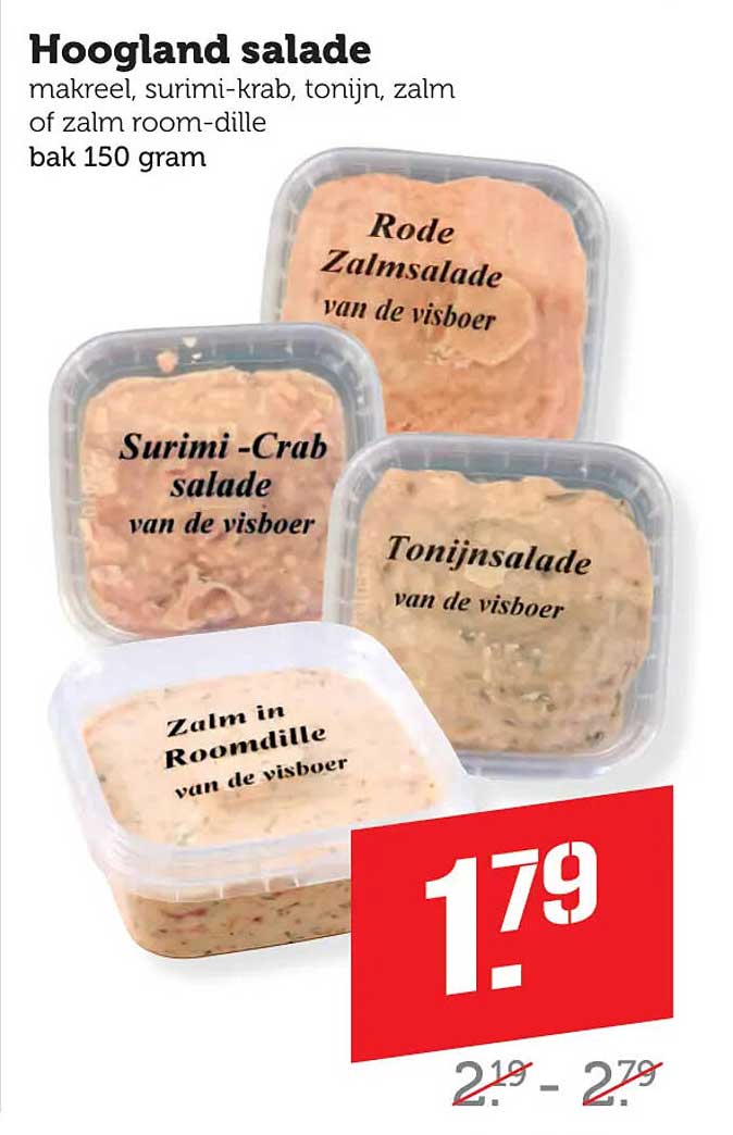 Ben je op zoek naar een heerlijke en veelzijdige salade voor bij de lunch of als toevoeging aan je diner? Dan is de Hoogland salade de perfecte keuze! Deze selectie van hoogwaardige vis-salades biedt een scala aan smaken, van romige zalm tot pittige surimi-krab. Tijd om je smaakpapillen te verwennen met deze geweldige deal!