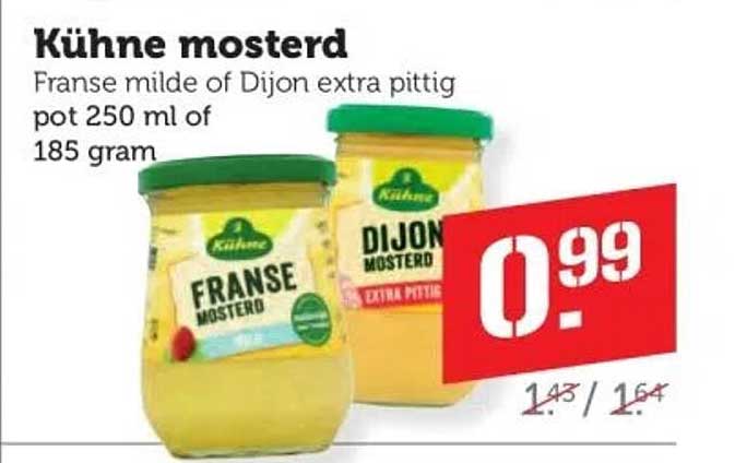 Ben je op zoek naar een smaakvolle toevoeging aan jouw maaltijden? Zoek niet verder! De Kühne mosterd is nu in de aanbieding en biedt een geweldige kans om jouw gerechten naar een hoger niveau te tillen. Met zowel de Franse milde als de Dijon extra pittige variant, kun je nu eenvoudig variëren in smaak. Deze verreikende mosterd is perfect voor een barbecue, bij een goede borrel of als smaakmaker in je favoriete gerechten.