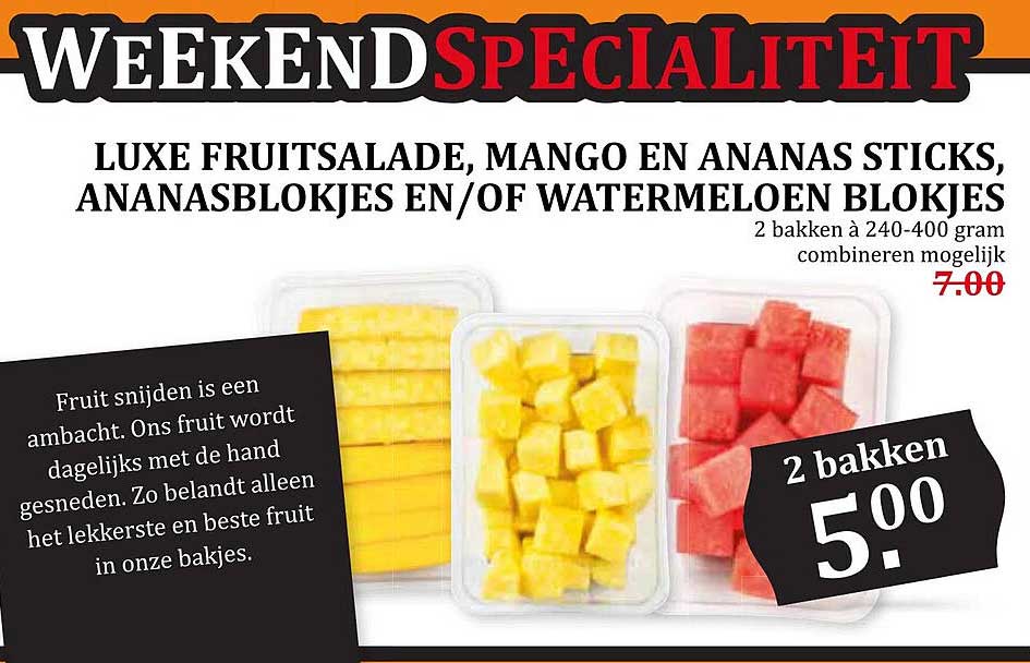 Geniet van onze overheerlijke luxe fruitsalade, speciaal samengesteld voor de echte fruitliefhebbers! Deze unieke mix van mango, ananas en watermeloen biedt niet alleen een explosie van smaak, maar ook een kleurrijke traktatie voor het oog. Van 28 juli tot en met 3 augustus kun je deze aanbieding scoren.