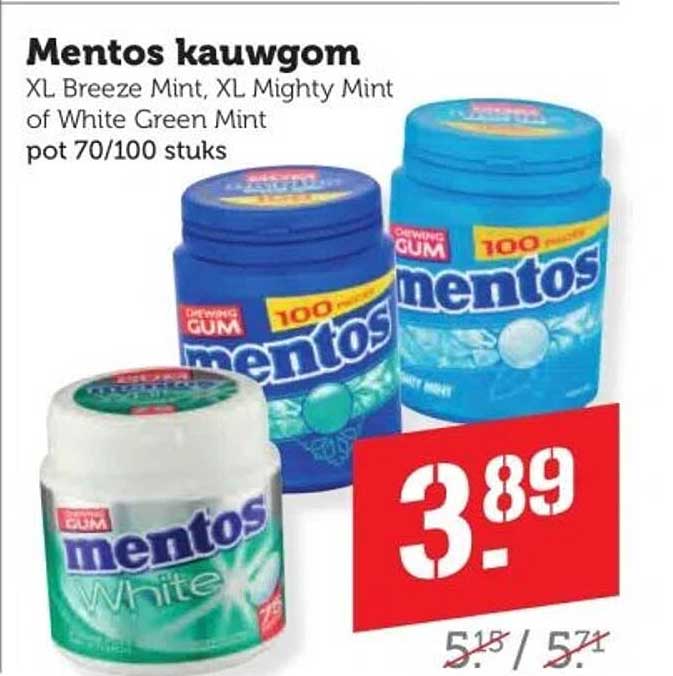 Ben je op zoek naar een verfrissende kauwgom die je de hele dag een frisse adem geeft? Dan is de aanbieding van Mentos kauwgom iets voor jou! Met smaken als XL Breeze Mint, XL Mighty Mint of White Green Mint biedt Mentos een heerlijke keuze voor iedere kauwgom liefhebber. Profiteer van deze aanbieding en geniet van de verkwikkende smaak van deze populaire kauwgom.