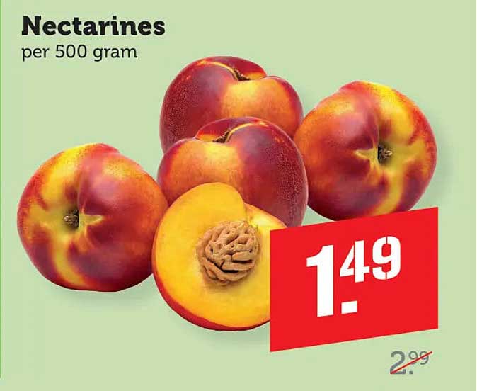 Met een prijs van slechts €1,49 voor 500 gram zijn deze nectarines een geweldige koop. Normaal gesproken betaal je meer voor deze kwaliteit en versheid. Dit is jouw kans om een gezonde keuze te maken zonder je portemonnee te zwaar te belasten. Geniet van de heerlijke smaak en de vele voordelen die deze nectarines bieden en profiteer van deze aanbieding!