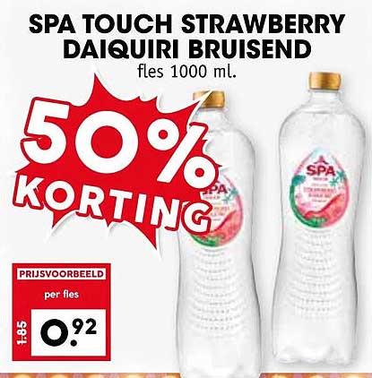 Geniet van een verfrissende traktatie met de SPA Touch Strawberry Daiquiri bruisend, nu met maar liefst 50% korting! Dit heerlijke drankje is perfect voor warme dagen of als een sprankelende toevoeging aan je feestjes. Een must-have uitstraling in elke koelkast!