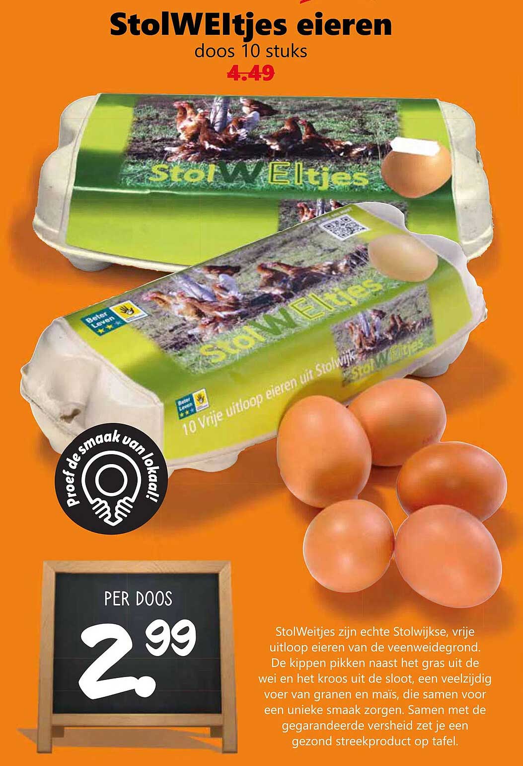 Met een prijs van slechts €2,99 per doos, bieden de StolWELtjes eieren een geweldige besparing ten opzichte van de normale prijs van €4,49. Profiteer nu van deze aanbieding en vul je koelkast met deze gezonde, lokale lekkernij!