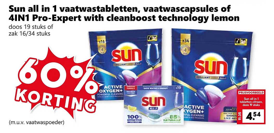 Bekijk nu de Sun all in 1 vaatwastabletten, vaatwascapsules of 4IN1 Pro-Expert with cleanboost technology lemon aanbieding in de Coop folder. Deze aanbieding is geldig van 13-10-2025 tot en met 19-10-2025.