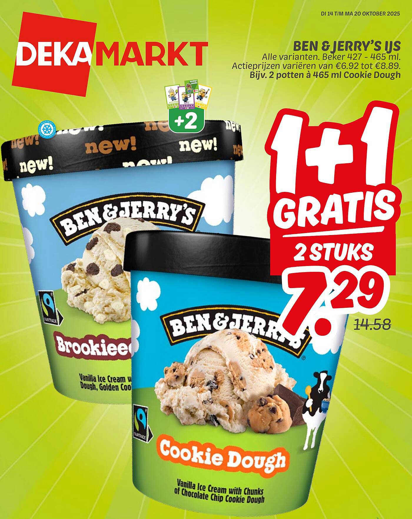 Bekijk nu de BEN & JERRY'S IJS 1+1 GRATIS aanbieding in de Dekamarkt folder. Deze aanbieding is geldig van 14-10-2025 tot en met 20-10-2025.