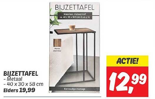 Bekijk de Bijzettafel aanbieding bij Dekamarkt! Deze fantastische aanbieding is nu beschikbaar in de nieuwste Dekamarkt folder. Profiteer van deze kans en bespaar flink op je aankoop.