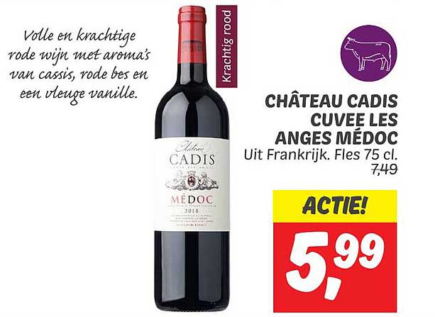 Bekijk de Château Cadis Cuvée Les Anges Médoc aanbieding bij Dekamarkt! Deze fantastische aanbieding is nu beschikbaar in de nieuwste Dekamarkt folder. Profiteer van deze kans en bespaar flink op je aankoop.