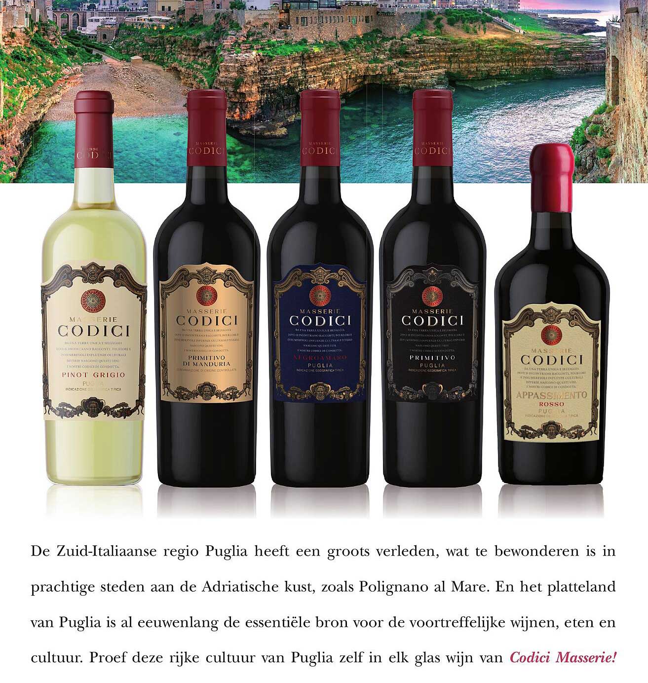 Ben je een liefhebber van kwaliteitswijnen? Dan is deze aanbieding zeker iets voor jou! Codici Masserie biedt een unieke selectie van wijnen uit de prachtige regio Puglia in Zuid-Italië. Elk glas vertelt een verhaal van traditie en kwaliteit. Deze aanbieding geeft je de kans om een paar van de beste Italiaanse wijnen te proeven tegen een scherpe prijs.