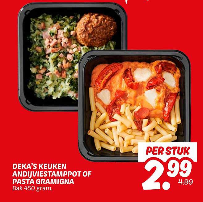 Ben je op zoek naar een snelle, smakelijke en voedzame maaltijd? Dan is deze aanbieding van Dekamarkt een echte aanrader! Met een keuze uit de heerlijke Andijviestamppot of de Pasta Gramigna, wordt jouw maaltijd in een handomdraai bereid. Perfect voor drukke weekavonden of wanneer je gewoonweg geen zin hebt om te koken.