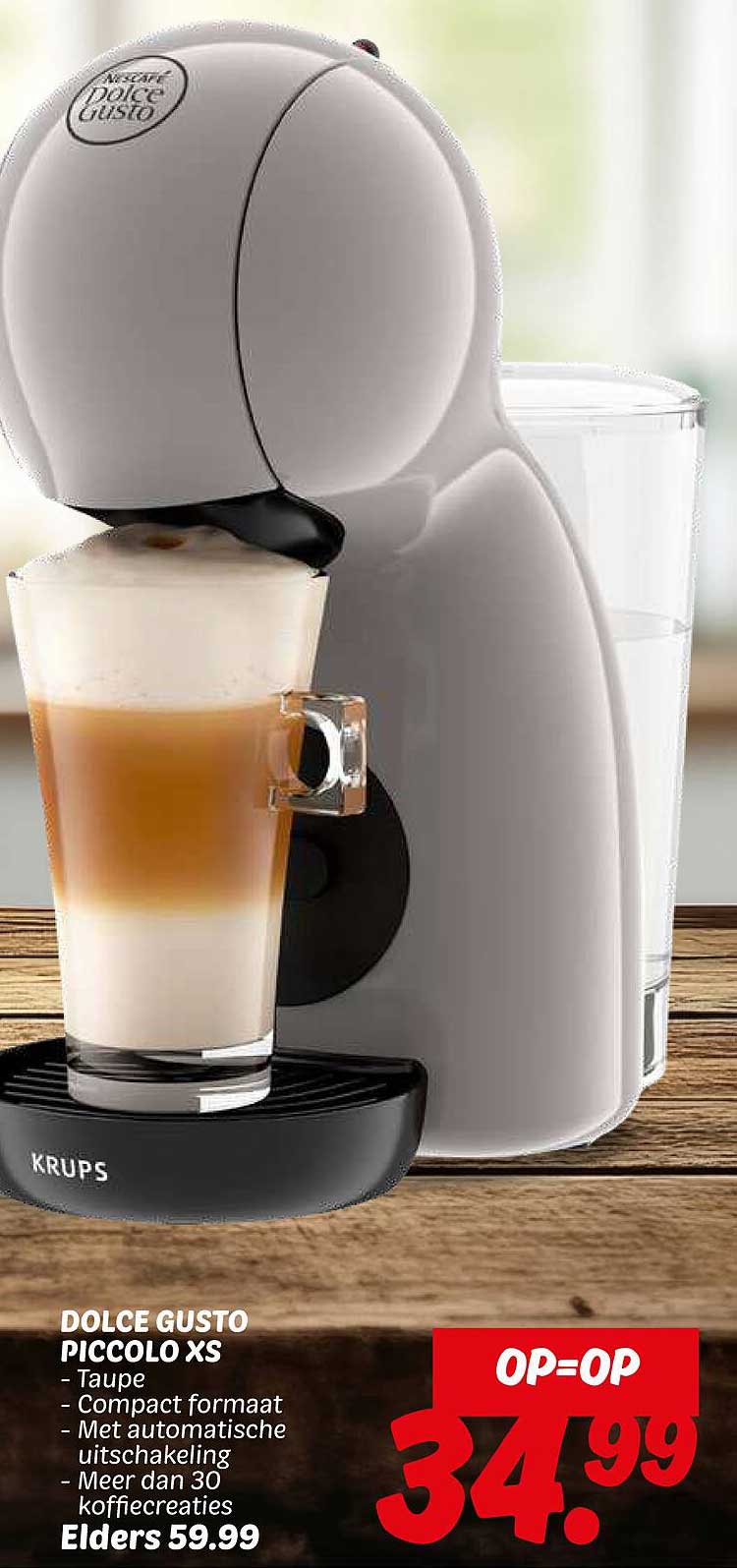 Wil jij elke dag genieten van een perfect kopje koffie? De DOLCE GUSTO PICCOLO XS is de perfecte koffiemachine voor jou! Met een compact ontwerp in een stijlvolle taupe kleur, past deze machine moeiteloos in ieder interieur. Vanaf 22 april tot en met 28 april kun je deze geweldige aanbieding niet missen. Voor slechts €34,99 krijg jij een apparaat dat jouw koffie-ervaring naar een nieuw niveau tilt.