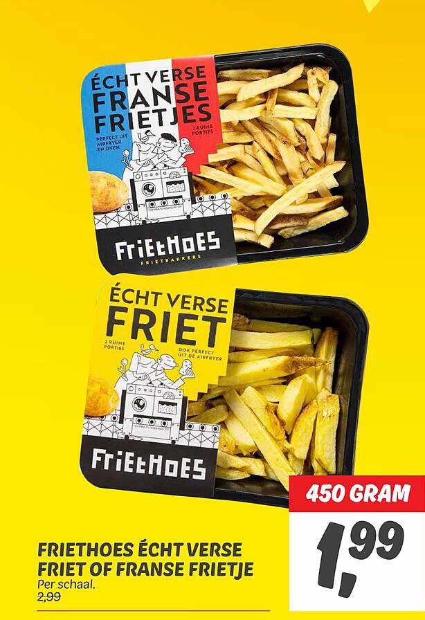 Bekijk de Friethoes Écht Verse Friet Of Franse Fritje aanbieding bij Dekamarkt! Deze fantastische aanbieding is nu beschikbaar in de nieuwste Dekamarkt folder. Profiteer van deze kans en bespaar flink op je aankoop.