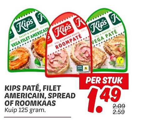Bij Dekamarkt vind je deze week een onweerstaanbare aanbieding voor KIPS Paté, Filet Americain, Spread of Roomkaas. Dit product is perfect voor een snelle en lekkere lunch of als hartige snack op ieder moment van de dag. Met een prijs van slechts €1,49 per stuk, in plaats van de gebruikelijke prijs van €2,09, is dit een kans die je niet wilt missen!
