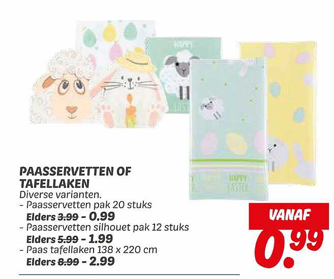 De aanbieding bevat diverse varianten van paasservetten, zoals een pak van 20 stuks voor slechts €0,99, en silhouette servetten in een pak van 12 stuks voor €1,99. Ook zijn er tafellakens te koop van 138 x 220 cm, met prijzen die beginnen vanaf €2,99. De producten zijn ideaal voor elk paasthema en zijn van goede kwaliteit.