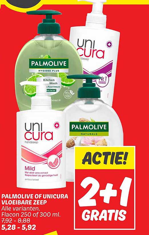 Bekijk de Palmolive Of Unicura Vloeibare Zeep aanbieding bij Dekamarkt! Deze fantastische aanbieding is nu beschikbaar in de nieuwste Dekamarkt folder. Profiteer van deze kans en bespaar flink op je aankoop.