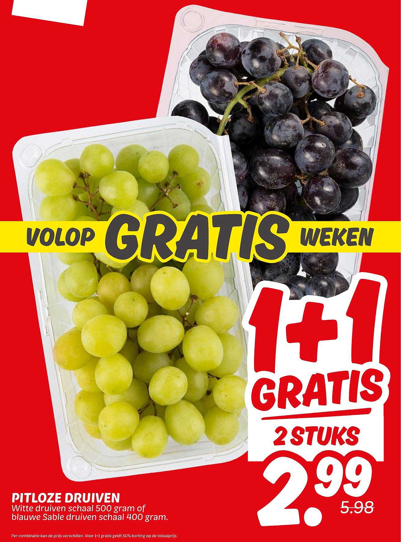 Bekijk de Pitloze Druiven aanbieding bij Dekamarkt! Deze fantastische aanbieding is nu beschikbaar in de nieuwste Dekamarkt folder. Profiteer van deze kans en bespaar flink op je aankoop.