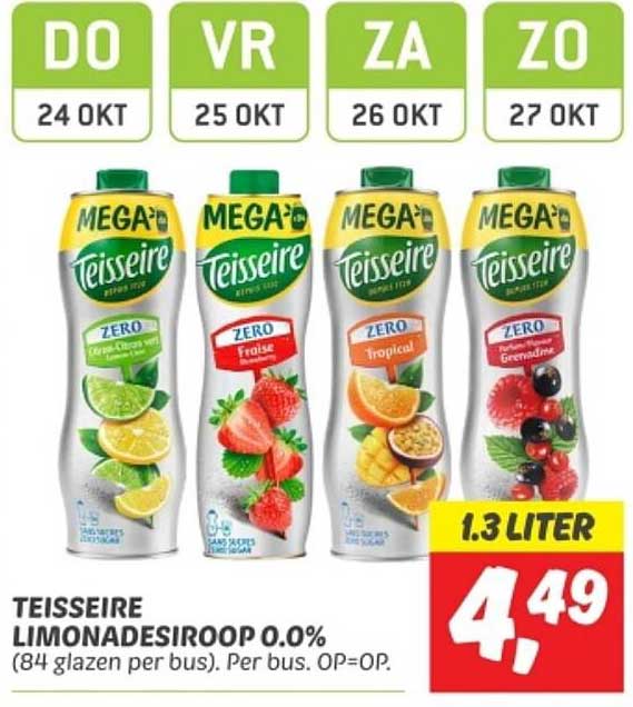 Bekijk de Teisseire Limonadesiroop 0.0% aanbieding bij Dekamarkt! Deze fantastische aanbieding is nu beschikbaar in de nieuwste Dekamarkt folder. Profiteer van deze kans en bespaar flink op je aankoop.