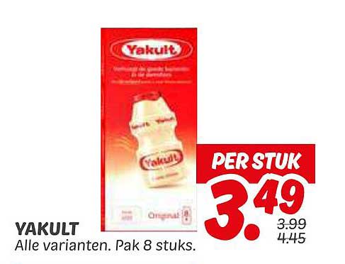 De prijs voor Yakult is nu slechts €3,49 per pak! Dit is een mooie korting ten opzichte van de reguliere prijs van €4,45. Met een besparing van bijna €1 per pak is het nu het perfecte moment om dit gezonde drankje in huis te halen. Laat deze kans niet aan je voorbijgaan!