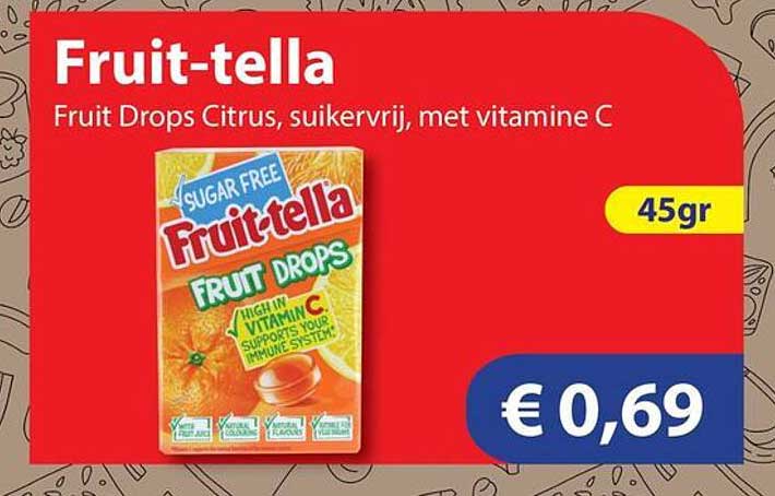 Ben je op zoek naar een heerlijke en gezonde snack? Kijk dan niet verder! Op deze pagina vind je de Fruit-tella Fruit Drops Citrus, helemaal suikervrij en boordevol vitamine C. Deze drops zijn perfect voor elk moment van de dag, of je nu onderweg bent, thuis ontspant of gezellig met vrienden bent. Met een onweerstaanbare citrus smaak, is dit een aanbieding die je niet wilt missen!