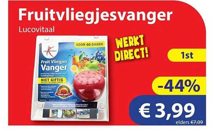 Heb je ook last van vervelende fruitvliegjes in huis? De Fruitvliegjesvanger van Lucovitaal biedt de oplossing! Dit handige product werkt effectief en lange tijd, zodat je weer kunt genieten van een vliegjesvrije ruimte. Deze aanbieding biedt je de kans om dit product voor een voordelige prijs aan te schaffen.