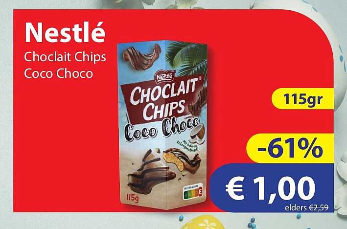 Ben je op zoek naar een heerlijke snack die perfect is voor elk moment van de dag? Dan is deze aanbieding echt iets voor jou! De Nestlé Choclait Chips Coco Choco zijn een onweerstaanbare lekkernij die je niet wilt missen. Met een geweldige korting van maar liefst 61% ontdek je nu deze smakelijke chips voor slechts € 1,00!