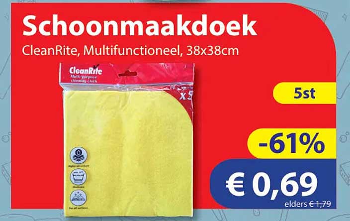 Wil je direct op de hoogte zijn zodra de Schoonmaakdoek in de aanbieding is? Meld je aan voor onze aanbiedingen-alert. Zo krijg je een melding zodra het product tegen een voordelige prijs beschikbaar is.