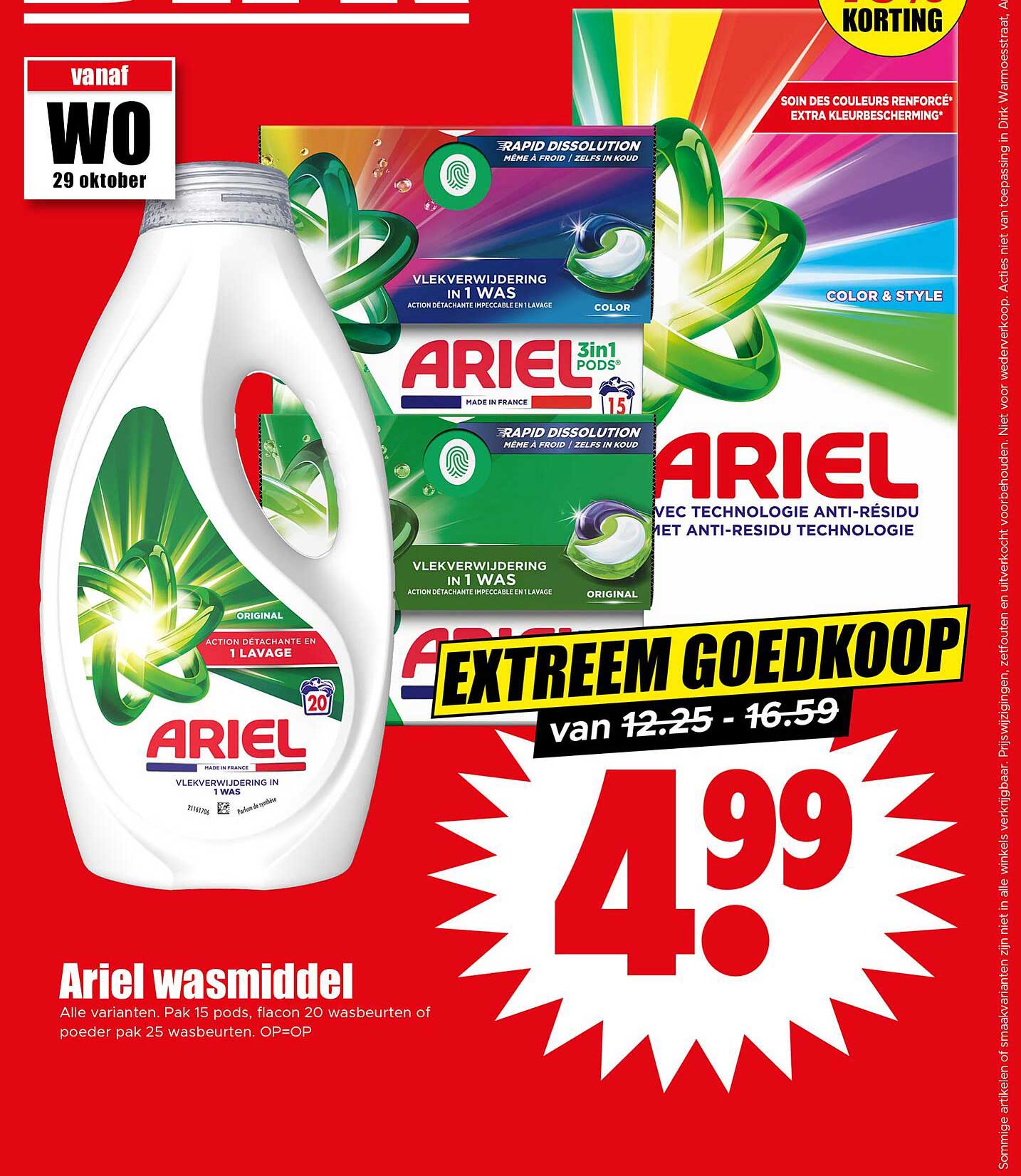 Bekijk nu de Ariel wasmiddel aanbieding in de Dirk folder. Deze aanbieding is geldig van 29-10-2025 tot en met 04-11-2025.