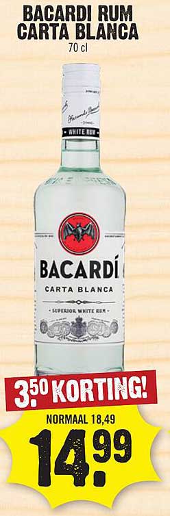 Ontdek de geweldige Bacardi Rum Carta Blanca aanbieding in de nieuwste Dirk folder. Naast deze aanbieding vind je nog veel meer aantrekkelijke kortingen. Je kunt de Bacardi Rum Carta Blanca eenvoudig online bestellen via de Dirk website of kopen in een winkel bij jou in de buurt.