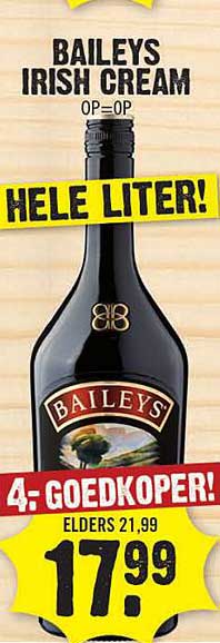 Ontdek de geweldige Baileys Irish Cream Hele Liter! aanbieding in de nieuwste Dirk folder. Naast deze aanbieding vind je nog veel meer aantrekkelijke kortingen. Je kunt de Baileys Irish Cream Hele Liter! eenvoudig online bestellen via de Dirk website of kopen in een winkel bij jou in de buurt.