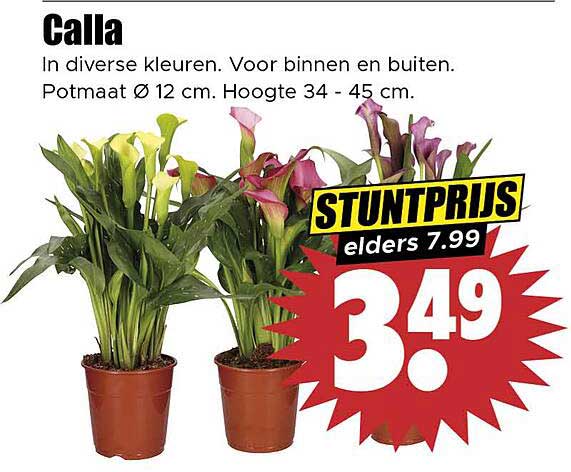 Deze schitterende Calla's zijn nu verkrijgbaar voor slechts € 3,49, terwijl de reguliere prijs elders maar liefst € 7,99 is. Dit betekent dat je een fantastische besparing van € 4,50 profiteert! Dit is dé kans om je groene vingers aan het werk te zetten met een aantrekkelijk aanbod.