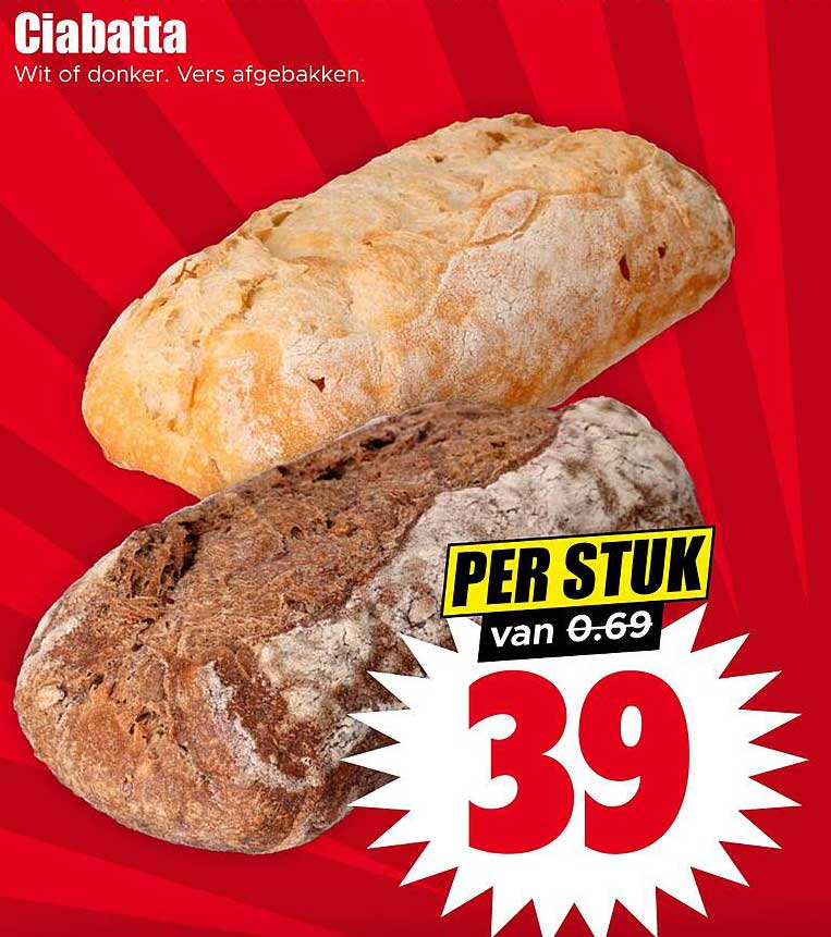 Bekijk de Ciabatta aanbieding bij Dirk! Deze fantastische aanbieding is nu beschikbaar in de nieuwste Dirk folder. Profiteer van deze kans en bespaar flink op je aankoop.