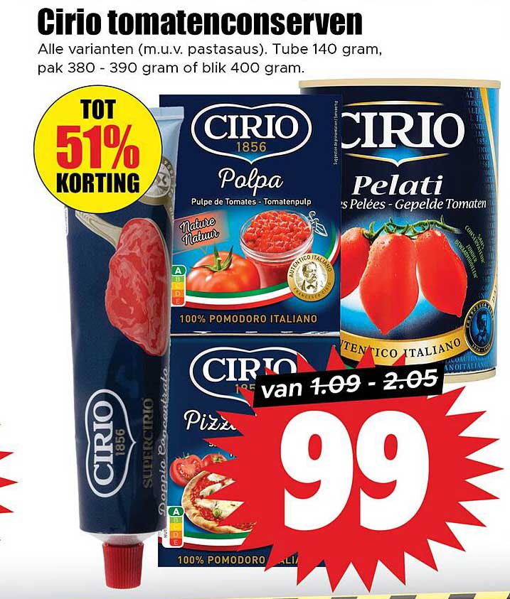 Ontdek de heerlijke wereld van Cirio tomatenconserven, nu met een geweldige korting! Of je nu van koken houdt of gewoon snel een maaltijd op tafel wilt zetten, deze tomatenconserven zijn de ideale keuze. Met een korting tot maar liefst 51% op diverse smaken en verpakkingen, is dit hét moment om je voorraad aan te vullen.
