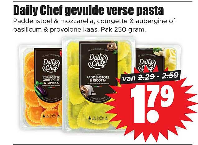 Bekijk de Daily Chef Gevulde Verse Pasta aanbieding bij Dirk! Deze fantastische aanbieding is nu beschikbaar in de nieuwste Dirk folder. Profiteer van deze kans en bespaar flink op je aankoop.