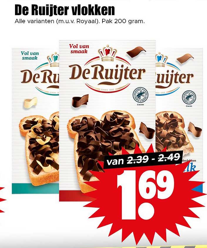 De reguliere prijs van De Ruijter vlokken ligt tussen de €2,39 en €2,49, maar nu kun je ze voor slechts €1,69 bemachtigen! Dit betekent een aanzienlijke besparing en een uitgelezen kans om deze heerlijke vlokken aan je voorraad toe te voegen.