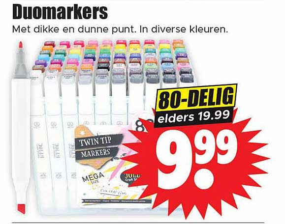 Ontdek de geweldige Duomarkers aanbieding in de nieuwste Dirk folder. Naast deze aanbieding vind je nog veel meer aantrekkelijke kortingen. Je kunt de Duomarkers eenvoudig online bestellen via de Dirk website of kopen in een winkel bij jou in de buurt.