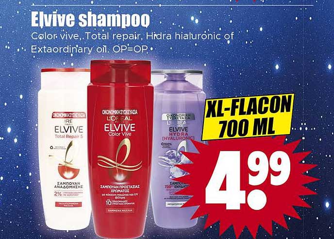 Ontdek de geweldige Elvive Shampoo aanbieding in de nieuwste Dirk folder. Naast deze aanbieding vind je nog veel meer aantrekkelijke kortingen. Je kunt de Elvive Shampoo eenvoudig online bestellen via de Dirk website of kopen in een winkel bij jou in de buurt.