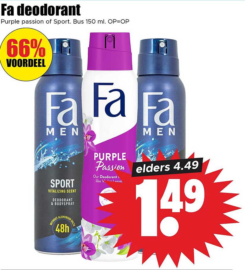 Normaal gesproken kost deze Fa deodorant €4,49, maar deze week kun je hem kopen voor slechts €1,49. Dit betekent dat je 66% bespaart! Deze aanbieding is tijdelijk, dus mis het niet. Waarom zou je meer betalen voor dezelfde kwaliteit? Dit is de ideale kans om kwaliteitsproducten in huis te halen zonder je budget te overschrijden.