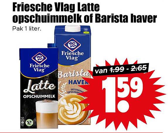 Bekijk nu de Friesche Vlag Latte opschuimmelk of Barista haver aanbieding in de Dirk folder. Deze aanbieding is geldig van 04-06-2025 tot en met 10-06-2025.