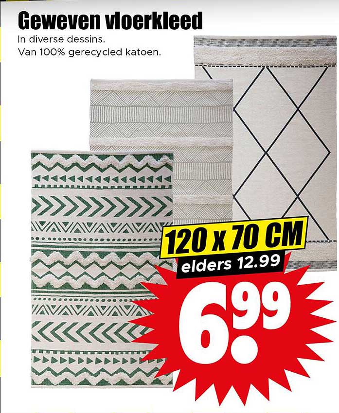 Op zoek naar een stijlvol en eco-vriendelijk vloerkleed? Dan is deze aanbieding van Dirk echt iets voor jou! Dit geweven vloerkleed is gemaakt van 100% gerecycled katoen en is verkrijgbaar in diverse trendy dessins. Het brengt niet alleen een sfeer van gezelligheid in je huis, maar helpt ook bij het verminderen van milieu-impact. Deze aanbieding is geldig van 28 september tot en met 4 oktober 2025, dus mis het niet!