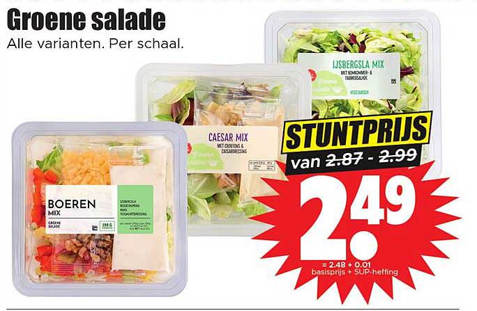Als je op zoek bent naar een gezonde en smaakvolle aanvulling op je maaltijden, dan is deze aanbieding echt iets voor jou! De groene salades in verschillende varianten zijn niet alleen lekker, maar ook een geweldige manier om je dagelijkse groentenbehoefte te vervullen. Van de frisse Boeren Mix tot de heerlijke Caesar Mix, je vindt vast de perfecte salade voor jouw smaak. En dat voor een stuntprijs!