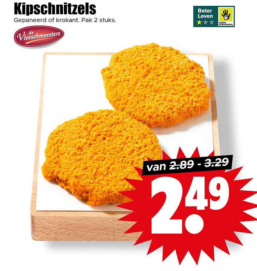 De kipschnitzels zijn nu verkrijgbaar voor slechts €2,49, terwijl de reguliere prijs tussen de €2,89 en €3,29 ligt. Dat betekent dat je flink kunt besparen met deze aanbieding! Een ideale gelegenheid om je voorraad aan te vullen zonder je budget te overschrijden. Geniet van deze kwalitatieve kipschnitzels voor een geweldige prijs!