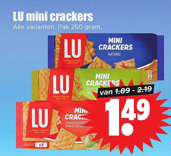 Ben je op zoek naar een heerlijke snack voor bij de borrel of gewoon om even van te genieten? Kijk dan niet verder! De LU mini crackers zijn nu in de aanbieding en bieden een perfecte mix van smaak en crunch. Deze aanbieding is geldig van 16 april tot en met 22 april 2025. Ideaal om je voorraad aan te vullen of om te delen met vrienden en familie tijdens gezellige momenten.