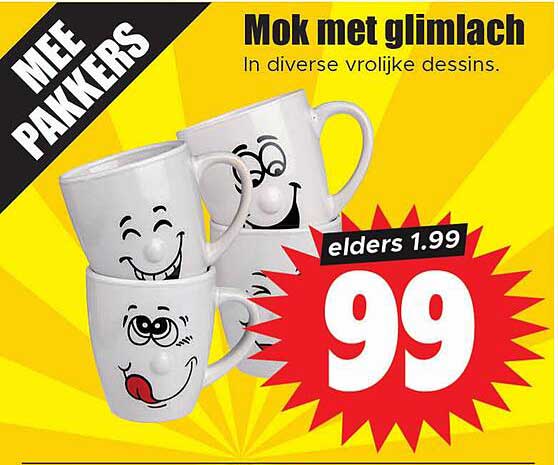 Ontdek de geweldige Mok Met Glimlach aanbieding in de nieuwste Dirk folder. Naast deze aanbieding vind je nog veel meer aantrekkelijke kortingen. Je kunt de Mok Met Glimlach eenvoudig online bestellen via de Dirk website of kopen in een winkel bij jou in de buurt.
