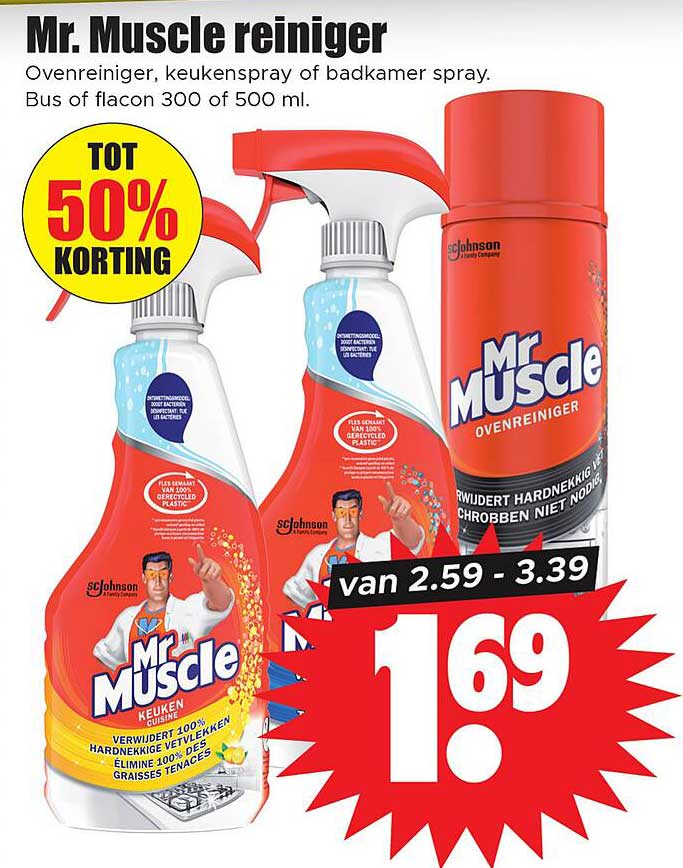 Normaal gesproken betaal je tussen de €2,59 en €3,39 voor de Mr. Muscle reiniger. Maar nu kun je hem verkrijgen voor slechts €1,69! Dit is een korting van maar liefst 50%! Een ideale kans om je schoonmaakarsenaal uit te breiden zonder je budget te overschrijden.