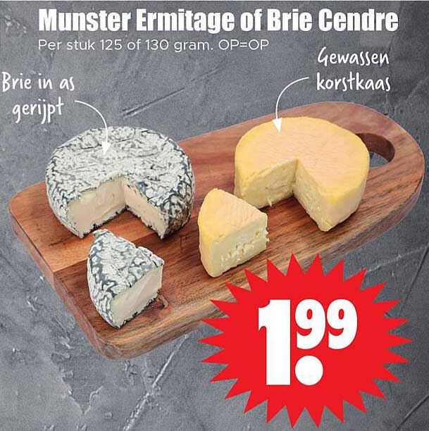 Bekijk nu de Munster Ermitage of Brie Cendre aanbieding in de Dirk folder. Deze aanbieding is geldig van 28-03-2025 tot en met 30-03-2025.