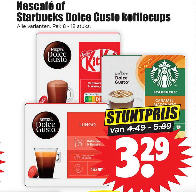 Bekijk de Nescafé Of Starbucks Dolce Gusto Koffiecups aanbieding bij Dirk! Deze fantastische aanbieding is nu beschikbaar in de nieuwste Dirk folder. Profiteer van deze kans en bespaar flink op je aankoop.