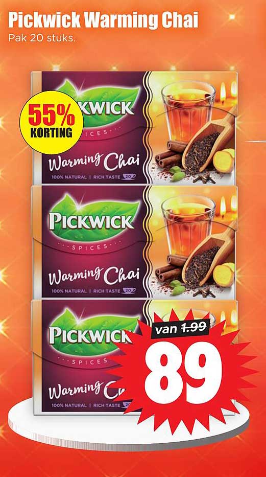 Ontdek de geweldige Pickwick Warming Chai aanbieding in de nieuwste Dirk folder. Naast deze aanbieding vind je nog veel meer aantrekkelijke kortingen. Je kunt de Pickwick Warming Chai eenvoudig online bestellen via de Dirk website of kopen in een winkel bij jou in de buurt.