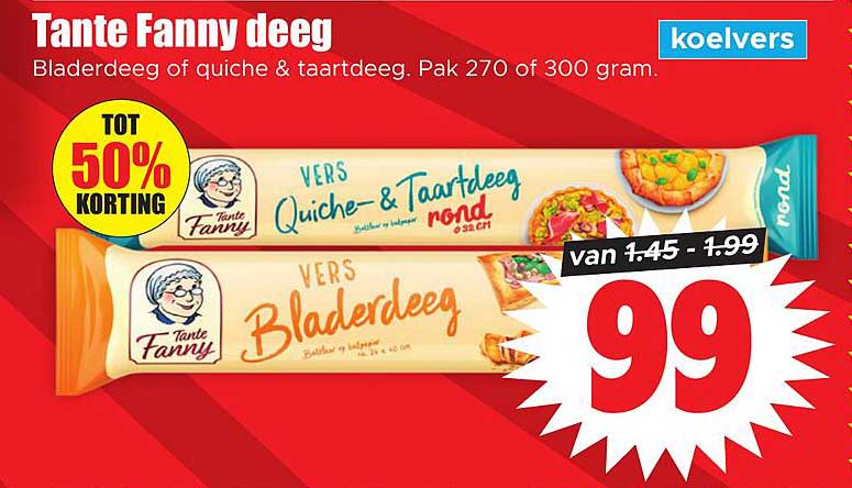 Bekijk de Tante Fanny Deeg aanbieding bij Dirk! Deze fantastische aanbieding is nu beschikbaar in de nieuwste Dirk folder. Profiteer van deze kans en bespaar flink op je aankoop.