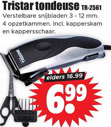 Bekijk de Tristar Tondeuse Tr-2561 aanbieding bij Dirk! Deze fantastische aanbieding is nu beschikbaar in de nieuwste Dirk folder. Profiteer van deze kans en bespaar flink op je aankoop.
