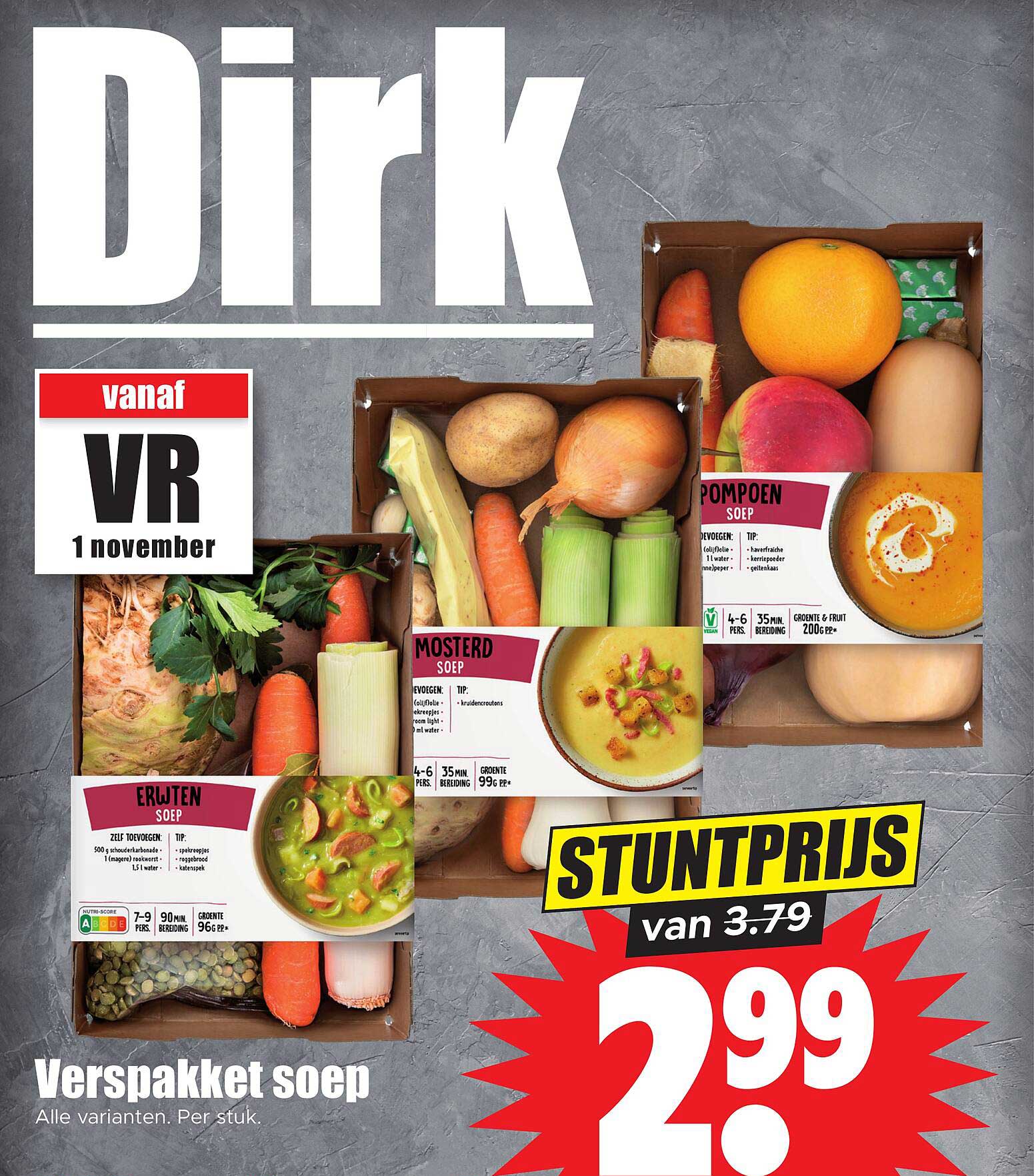 Bekijk de Verspakket Soep aanbieding bij Dirk! Deze fantastische aanbieding is nu beschikbaar in de nieuwste Dirk folder. Profiteer van deze kans en bespaar flink op je aankoop.